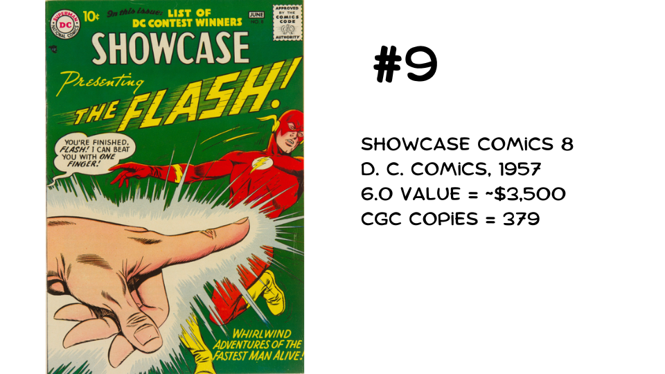 At #9, with 379 copies, we have Showcase #8, the second appearance of the Silver-Age Flash. It also features the first appearance of Captain Cold—a lesser-known character rumored (though not confirmed!) to be the father of ‘90s rapper Vanilla Ice.