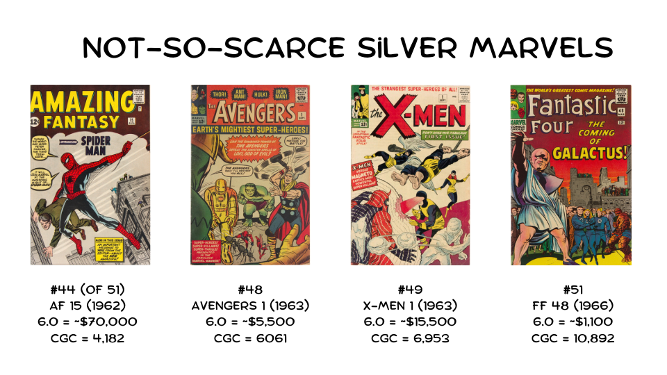 For the most part, they fall in the back half of the scarcity rankings. In fact, positions #44 through #51 are packed with Marvel keys. Amazing Fantasy #15 sits at 4,182 copies, while Fantastic Four #48 (first Silver Surfer and Galactus) reaches a staggering 10,892 copies.
