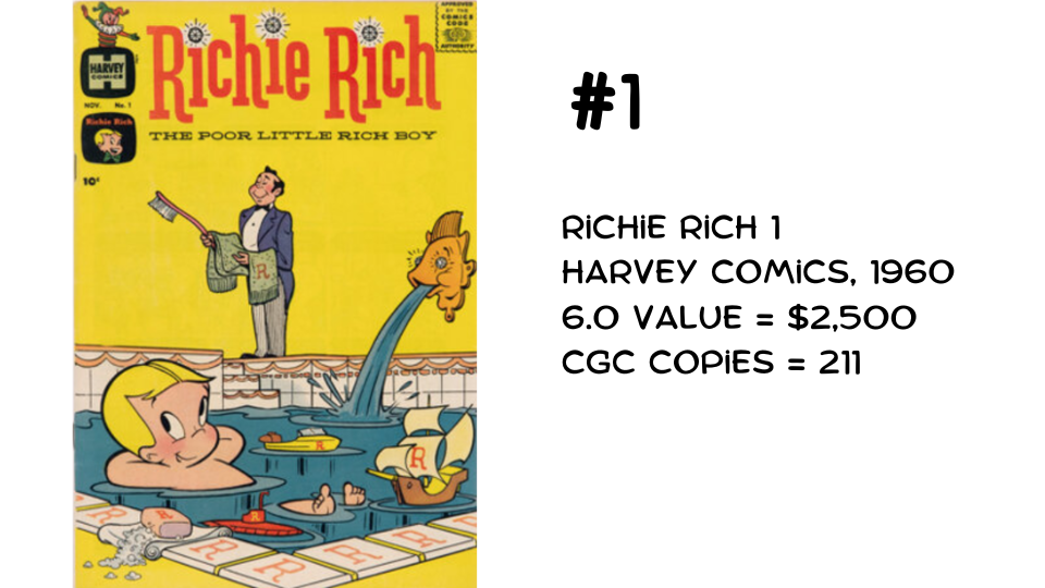 With four fewer copies—211 total—we arrive at #1: Richie Rich #1. This makes it the scarcest—and surprisingly, one of the most valuable—Silver-Age comic books. It’s not DC, not Marvel, but Harvey Comics. It’s also the only book in the Top 10 from the 1960s (1960); every other entry comes from the 1950s.