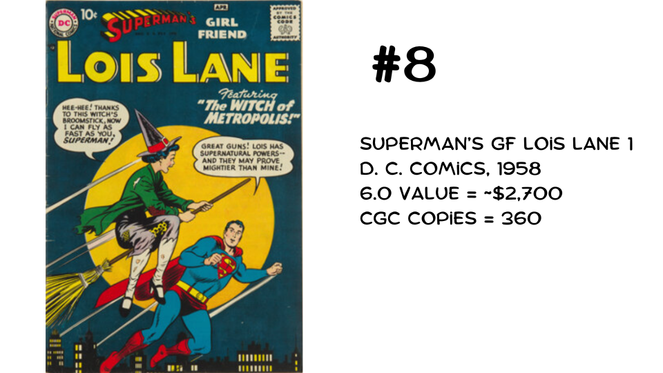 With 360 copies, Superman’s Girlfriend Lois Lane #1 takes the #8 spot. Lois debuts in her own title—famously flying on a broom. It really speaks to Superman’s brand strength that so many supporting characters received solo books (Superboy, Jimmy Olsen, Lois Lane, and more).