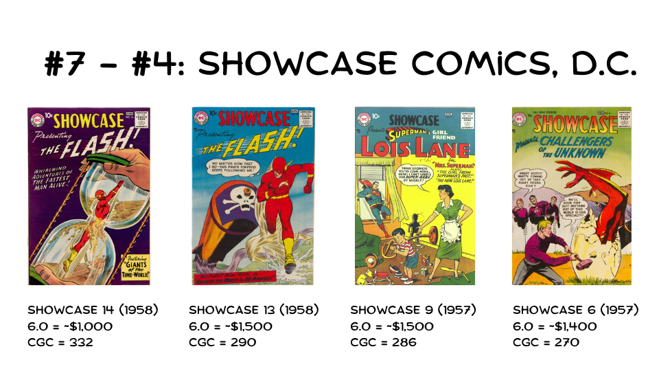 Early Showcase issues dominate spots #7 through #4, with CGC counts ranging from 332 down to 270. These include early Flash appearances, the Lois Lane tryout issue (which clearly worked—see #8), and the debut of the Challengers of the Unknown.