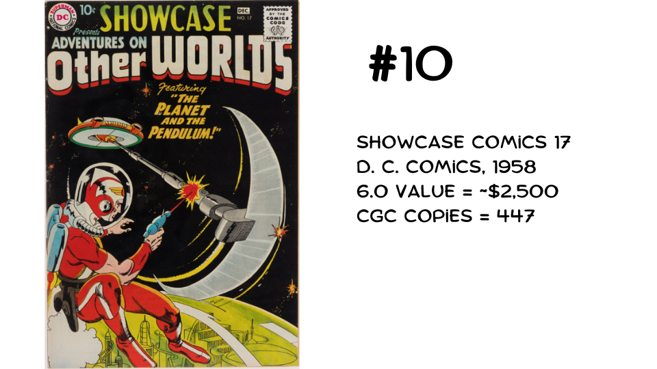 Kicking us off at #10 is the first appearance of Dr. Adam Strange, who figured prominently in the era’s science fiction sub-genre. A total of 447 copies of Showcase #17 have been graded by CGC to date.