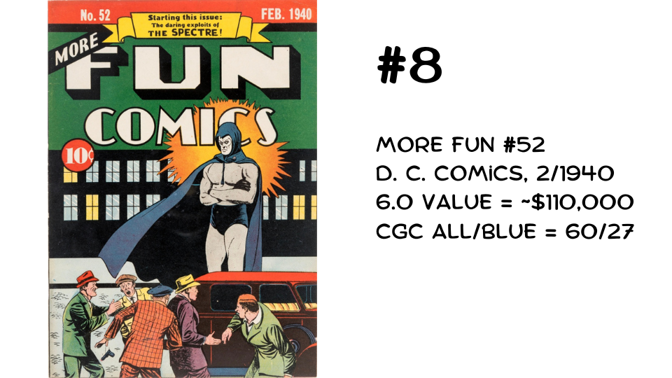 Eighth on our list is More Fun Comics #52, which features the debut of DC’s mysterious character, the Spectre. Notice that his cowl is blue. In the next issue and thereafter, it’s green—an interesting early color change that’s less well known than the gray-to-green shift seen from Hulk #1 to Hulk #2.