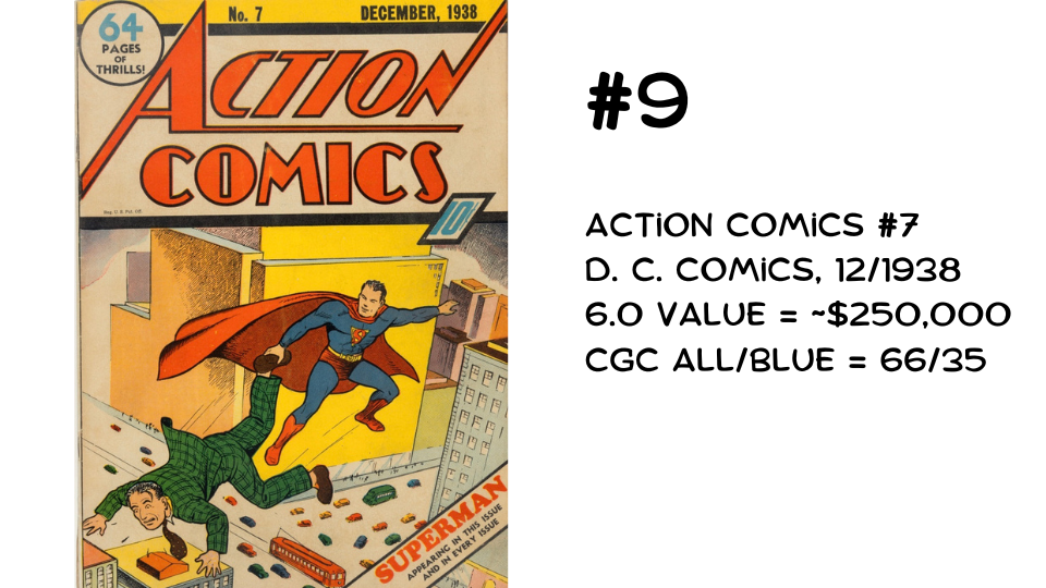 While Action #2 is the second appearance of Superman, the fact that he isn’t on the cover suppresses its value. Though still costly, it sells for a fraction of Action Comics #7.