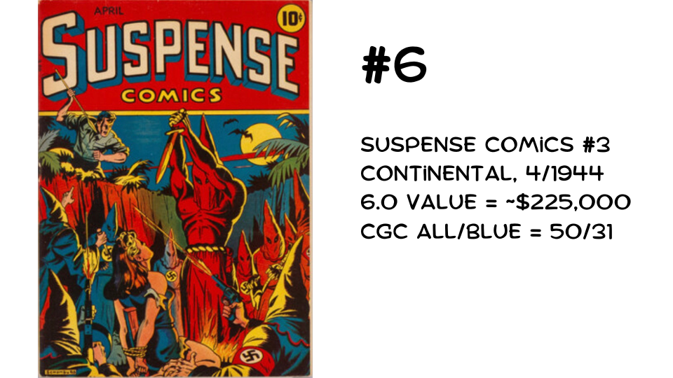 At #6, we have the biggest oddity on this list. There’s no tie-in with a superhero, no first issue, and no major historical milestone. So how does Suspense Comics #3 make the cut? Simple: it features a masterpiece of a cover drawn by the era’s greatest cover artist, Alex Schomburg.