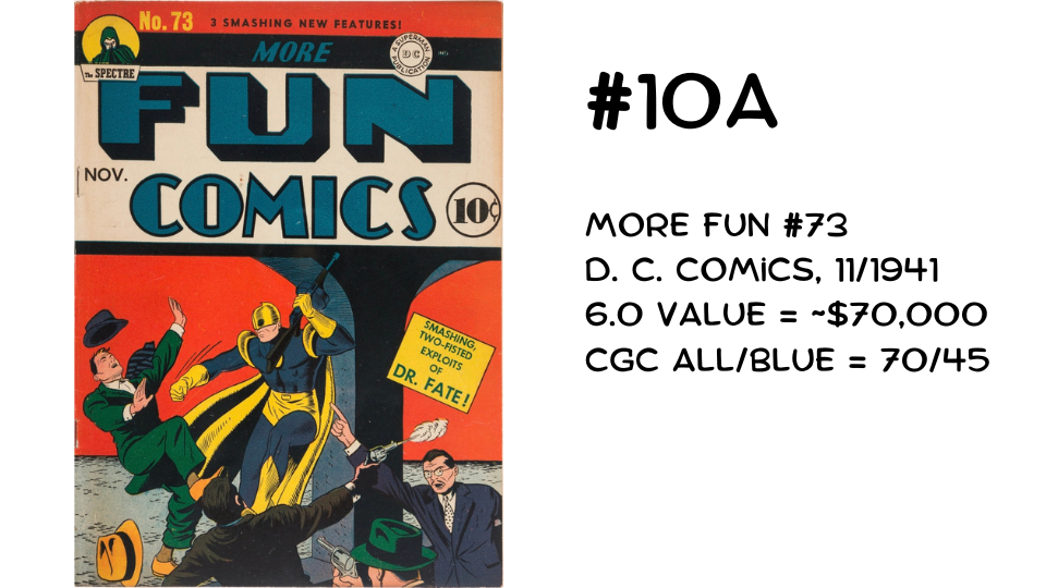 Without further ado, the 10 Rarest Mega-Grails list starts at 70 copies certified by CGC. We have a tie at the entry spot—and this one is chock-full of star power. Hidden inside the pages of More Fun Comics #73 are the first appearances of Aquaman and Green Arrow. Speedy also debuts here.