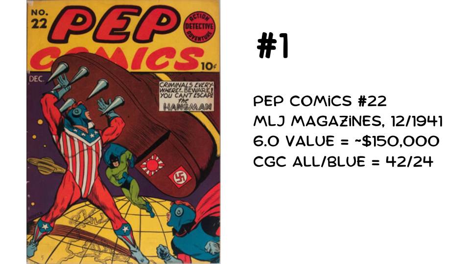 At the top of the list is Pep Comics #22, with a mere 42 copies on the CGC census. Like More Fun Comics #73 at the tail end of our list, the significance of this book is hidden within its pages. It features the first appearance of Archie Andrews, America’s favorite teenager.