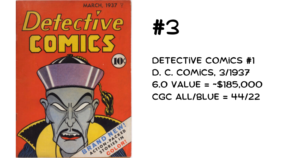 Now we’re getting into notoriously difficult books to find. Detective Comics #1 is the earliest-published book on this list (March 1937). Overstreet classifies it as Golden Age, though some collectors consider it Platinum Age because it predates Action Comics #1 by over a year.